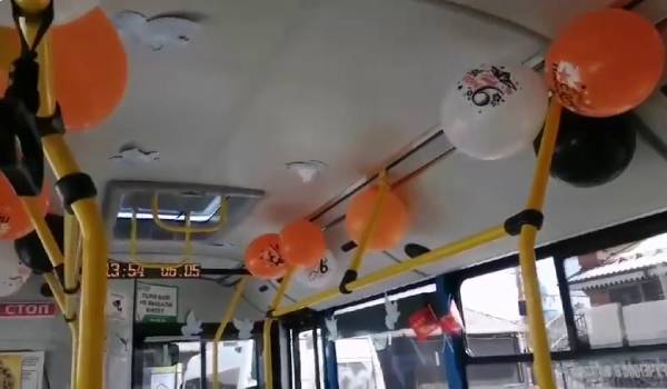 Водитель Александр Лоскутов и кондуктор Татьяна Савостина постарались на славу – в салоне появились шары, флажки и праздничные плакаты. Там звучит музыка военных лет.