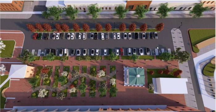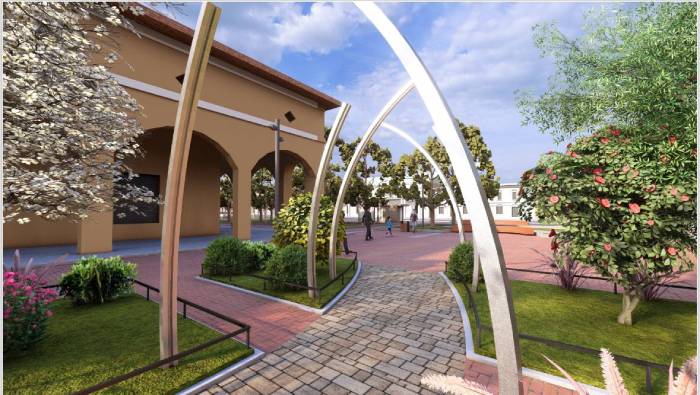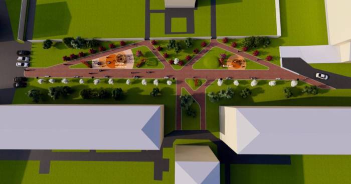 Первую общественную территорию хотят озеленить, установить там урны и открытую беседку со скамьёй, сделать прогулочку зону с лавками, освещение, обустроить парковку для автомобилей и привести в порядок территорию около часовни. «Фишкой» обновлённой зоны отдыха станут незавершённые арки, отсылающие к аркам Гостиных дворов.