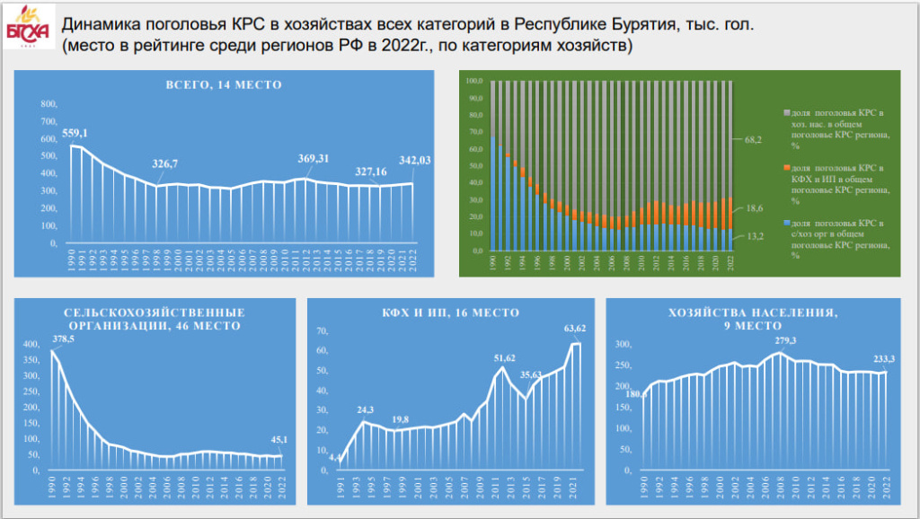 Коллектив учёных Бурятии исследовал динамику поголовья овец и структуры производства в хозяйстве всех категорий в регионах Российской Федерации и создал атлас динамики поголовья крупного рогатого скота в регионах РФ за период с 1990 по 2022 год. Работы в рамках научных исследований межрегионального научно-образовательного центра «Байкал» проводили межкафедральная научная лаборатория «Экономика сельского хозяйства и природопользования» и БУПЦ «Агроконсалтинг» Бурятской сельхозакадемии.
