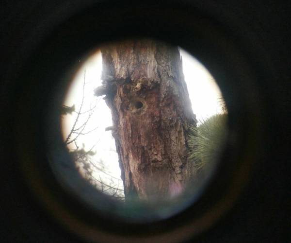 Самка обыкновенного поползня уже занялась ремонтом летка у гнезда.