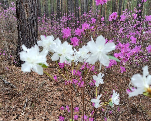 Студенты и преподаватели агрономического факультета Бурятской государственной сельхозакадемии недавно обнаружили рододендрон даурский (Rhododendron dauricum L.) с белыми цветками. В народе его называют багульник.
