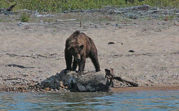 На следующий день инспекторы выехали к этому месту и выяснили, что медведь задавил взрослого лося. Зверь по-прежнему охранял свою добычу, и сотруднику заповедника Фёдору Мартусову удалось сделать фото.