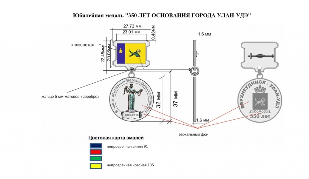 По заказу муниципального бюджета изготовят медали двух видов. На аверсе (лицевой стороне) юбилейной медали «350 ЛЕТ ОСНОВАНИЯ ГОРОДА УЛАН-УДЭ» будет расположена композиция в виде скульптуры «Мать Бурятия» и надпись «В честь основания Верхнеудинска-Улан-Удэ». Все буквы и изображения выпуклые и матовые, а фон с зеркальной полировкой. Оттиск герба Улан-Удэ будет на оборотной стороне (реверсе) медали.