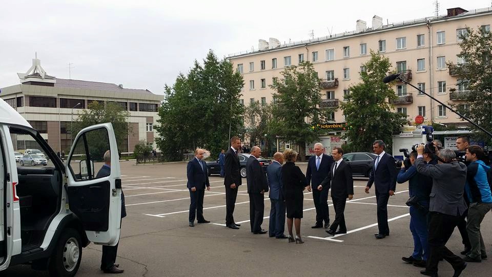 Медведев осмотрел один из переданных Бурятии автомобилей, заметив, что «это первая поставка, в которой машины оборудованы кондиционерами».