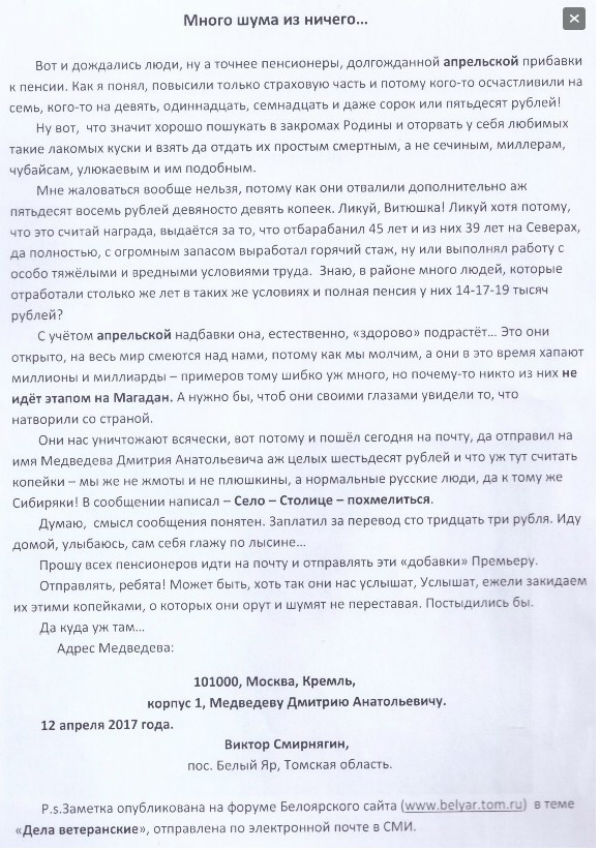 Пенсионер Виктор Смирнягин из посёлка Белый Яр Томской области отправил 60 рублей своей прибавки к пенсии в Кремль