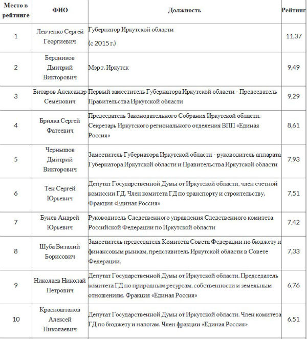 Возглавил рейтинг влиятельности губернатор Иркутской области Сергей Левченко. На втором месте оказался мэр Иркутска Дмитрий Бердников, третьим стал первый заместитель губернатора — председатель правительства региона Александр Битаров.