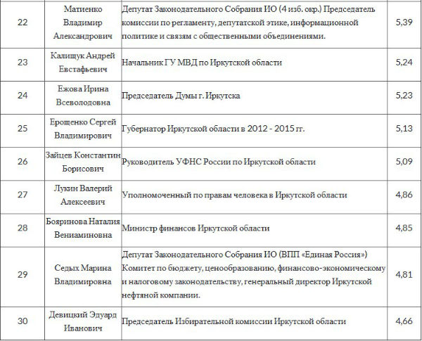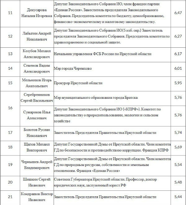 опубликовал «Рейтинг влиятельности политиков Иркутской области Топ-30». По мнению авторов, подобное исследование «поможет сформировать более чёткую картину расстановки сил на политическом рынке Иркутской области». Рейтинг создавался при помощи экспертного опроса и контент-анализа.