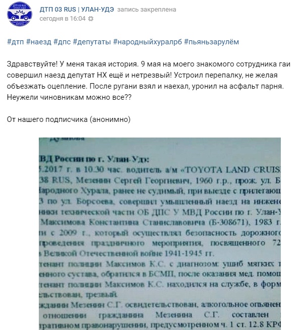 Согласно написанному в нём, в 10:30 утра водитель внедорожника «Тойота Ленд Крузер», 57-летний депутат Народного Хурала Бурятии Сергей Мезенин, совершил умышленный наезд на 34-летнего лейтенанта ДПС. Сотрудник осуществлял безопасность дорожного движения одного из мероприятий празднования Дня Победы. Автоинспектор получил ушиб мягких тканей и коленного сустава. Ему оказали помощь в БСМП и отпустили домой. Он был трезв. В этом документе также утверждается, что водитель был привлечён за управление в состоянии опьянения.