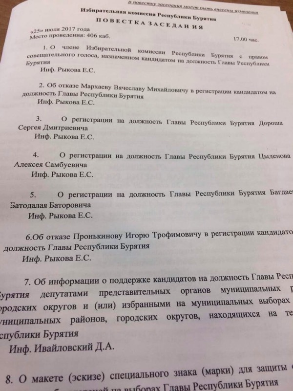 Сегодня избирком Бурятии вынес судьбоносное решение о том, что Вячеслав Мархаев не сумел пройти муниципальный фильтр – поддержка 7% депутатов районного и поселкового уровня. Таким образом, Вячеслав Мархаев сошел с предвыборной гонки. Как явствует из решения избиркома причин этому несколько. Это как наличие сдвоенных подписей, так и небрежное отношение к документам.
