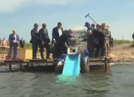 Контейнер с около 50 тыс. штук мальков был установлен на небольшом деревянном пирсе возле визит-центра заповедника, уточняет ТАСС. Президенту рассказали о работах на Байкале и показали мальков в открытой ёмкости рядом с контейнером. Глава государства сначала выпустил несколько мальков в озеро с помощью сачка, а затем остальную рыбу - потянув за специальный рычаг на крышке контейнера.