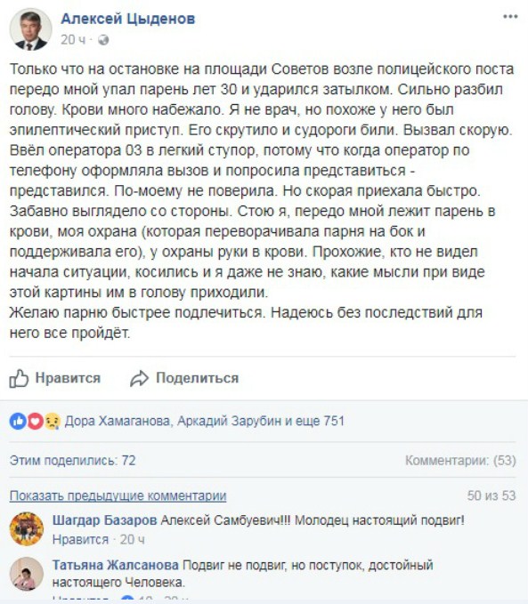 Как сообщал «Байкал-Daily», накануне днём глава Бурятии Алексей Цыденов, проходя по площади Советов, спас жизнь молодому человеку. У него случился эпилептический припадок, он упал и ударился головой. Алексей Цыденов, оказавшись рядом, лично вызвал «скорую», оператор которой, к слову, не поверила в личность звонившего.