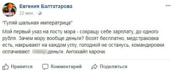 «Гуляй шальная императрица». Мой первый указ на посту мэра - сокращу себе зарплату, до одного рубля. Зачем мэру вообще деньги? Возят бесплатно, медстраховка есть, накрывают на каждом углу, голодной не останусь, командировки оплачивают. Антихайп, карочи», - написала Балтатарова.