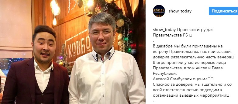 - В декабре мы были приглашены на встречу правительства, нам доверили развлекательную часть вечера. В игре приняли участие первые лица правительства, в том числе и глава республики. Алексей Самбуевич оценил. Спасибо за доверие, мы тщательно и со всей ответственностью подходим к организации выездных мероприятий, - пишут на странице в социальной сети организаторы игры.