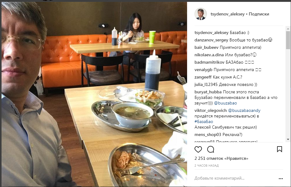 Сегодня глава Бурятии Алексей Цыденов опубликовал не совсем привычный снимок на своей страничке в Instagram. Он сделал селфи за столиком в улан-удэнском кафе «Бууза Бао». На снимке видно несколько блюд и посетителей заведения.