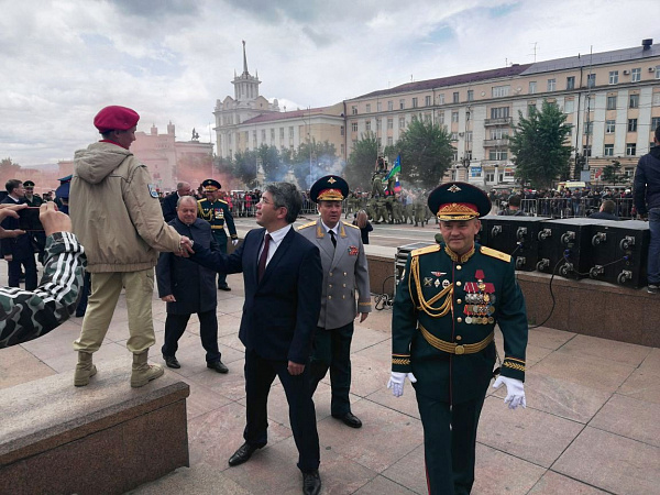В ходе юбилейных мероприятий глава республики принял участие в церемонии вручения Боевого Знамени 36 общевойсковой армии Командующим войсками Восточного военного округа, поблагодарил за службу военнослужащих.