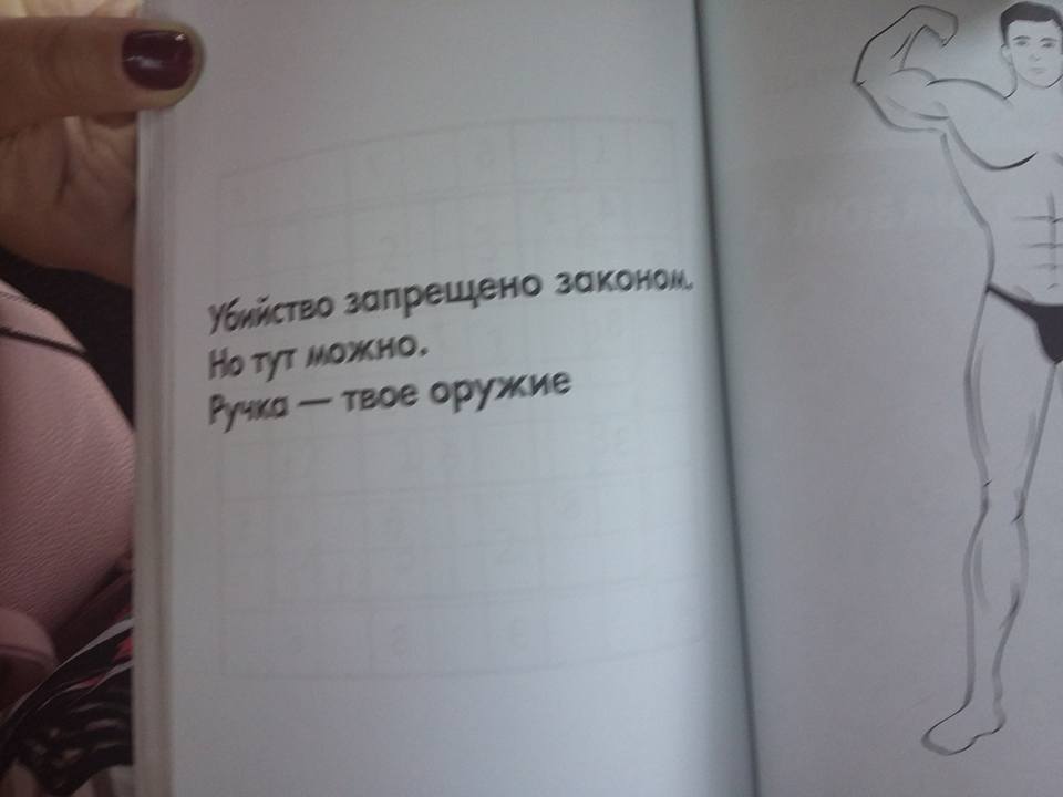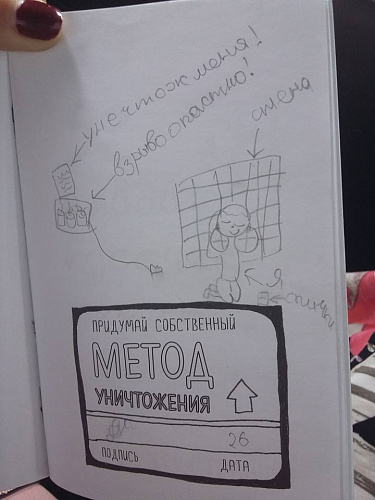 Есть предложение придумать свой собственный метод уничтожения. Имеется и такая запись: «Убийство запрещено законом. Но тут можно. Ручка – твое оружие» по соседству с изображённым человеком.