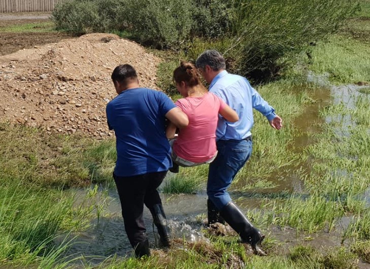 Пресс-секретарь главы Бурятии Алексей Фишев поделился фото работы Алексея Цыденова в Эрхирике. На одном из снимков запечатлено, как глава в резиновых сапогах c ещё одним мужчиной переносят женщину через подтопленную территорию.