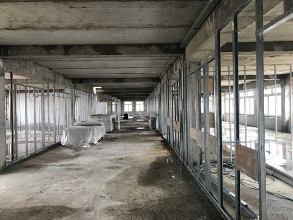 Сейчас на объекте ведутся работы по устройству стропильных систем кровли, навесного фасада; монтаж оконных блоков, внутренние отделочные работы, устройство перегородок, прокладка трубопроводов, воздуховодов, кабелей внутренних инженерных систем.