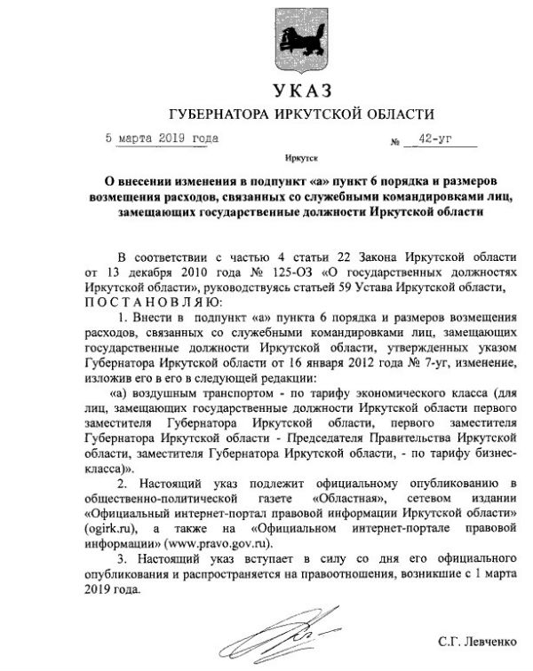 Заместителям губернатора Иркутской области разрешили летать в рабочие командировки бизнес-классом. Соответствующий указ губернатора Сергей Левченко подписал ещё в марте 2019 года, но сегодня на него обратило внимание издание IRK.ru.