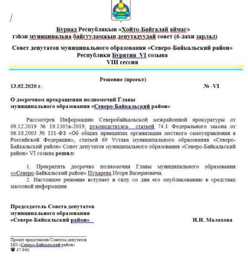 13 февраля состоялась сессия райсовета депутатов Северо-Байкальского района Бурятии. Ещё до её начала телеграмм-канал «Северобайкальский таежник» опубликовал повестку, одним из вопросов которой был вопрос о досрочном прекращении полномочий главы района Игоря Пухарева.