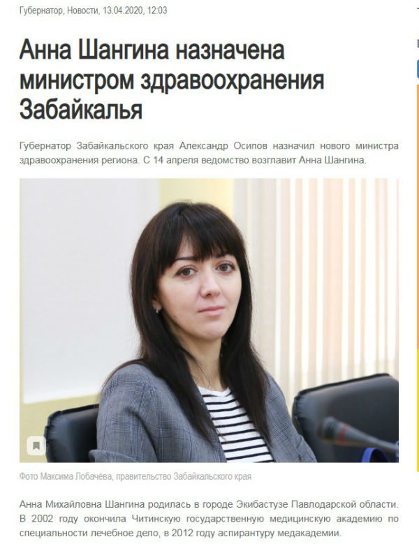 «Губернатор Забайкальского края Александр Осипов назначил нового министра здравоохранения региона. C 14 апреля ведомство возглавит Анна Шангина», - сказано в сообщении. После в нём даётся краткая биография Шангиной. О Валерии Кожевникове ни слова. Что же произошло? В пресс-службе губернатора забыли, чем различаются министр и исполняющий обязанности? Кожевникова увольняют за его спиной? Пока официальных комментариев больше не поступало.
