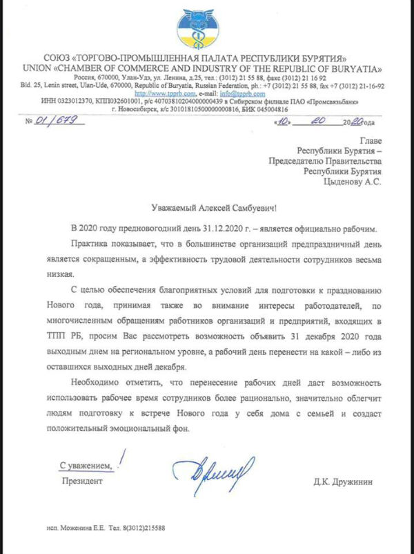 Депутат Народного Хурала, президент Торгово-промышленной палаты Бурятии Дмитрий Дружинин обратился к главе Бурятии с просьбой объявить 31 декабря нерабочим днём. О своём обращении он сообщил в Facebook.
