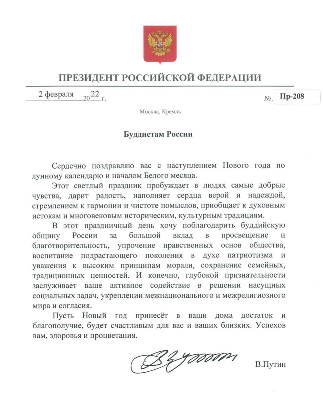 - В этот праздничный день хочу поблагодарить буддийскую общину России за большой вклад в просвещение и благотворительность, упрочение нравственных основ общества, воспитание подрастающего поколения в духе патриотизма и уважения к высоким принципам морали, сохранение семейных, традиционных ценностей. И конечно, глубокой признательности заслуживает ваше активное содействие в решении насущных социальных задач, укреплении межнационального и межрелигиозного мира и согласия, - говорится в поздравлении.