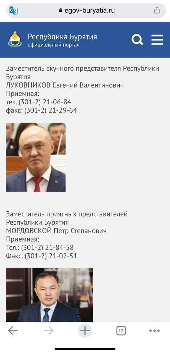Недавно популярный местный паблик «Весь Улан-Удэ» обратил внимание на то, что кто-то переименовал должности зампредов республиканского правительства. К примеру, ответственный за инфраструктуру Евгений Луковников превратился в «заместителя скучного представителя правительства Бурятии», Пётр Мордовской, курирующий вопросы безопасности – в «заместителя приятных представителей», а главная по социалке (и по совместительству – министр здравоохранения) Евгения Лудупова – в «заместителя неприятного представителя».
