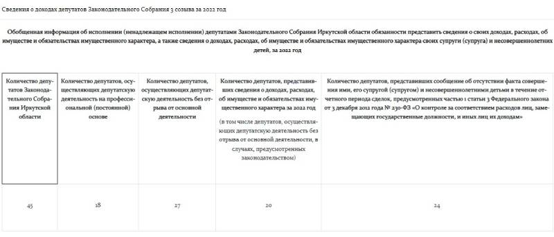 Информацию о заработке и имуществе в обобщённом виде также представили депутаты заксобрания соседнего Приангарья и Новосибирской области.