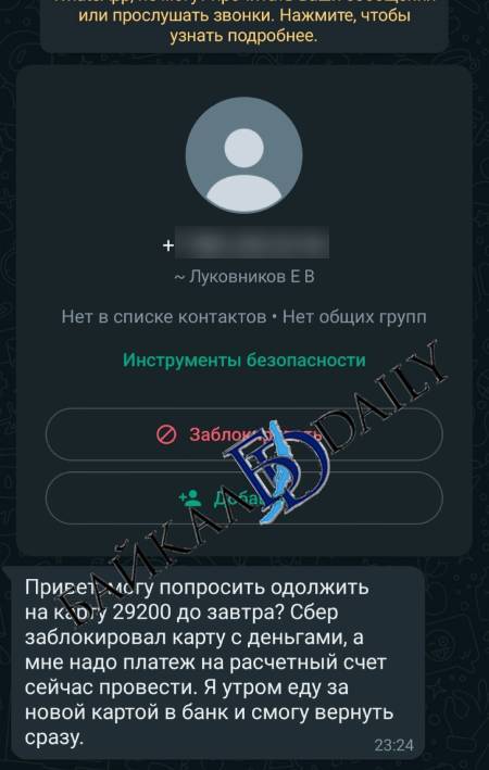 «Привет. Могу попросить одолжить до завтра 29 200? Сбер заблокировал карту с деньгами, а мне надо платёж на расчётный счёт сейчас провести. Я утром еду за новой картой в банк и смогу вернуть сразу».