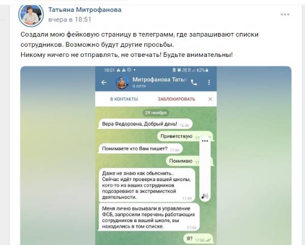 «Создали фейковую страницу председателя комитета по образованию Татьяны Митрофановой в Telegram», - такое сообщение появилось вечером 29 ноября в официальном телеграм-канале комитета.