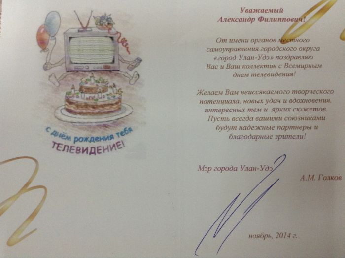 Стоит отметить, что сегодня же, в честь Международного дня телевидения, Александр Левашов получил поздравительную открытку от Александра Голкова.