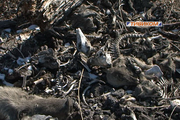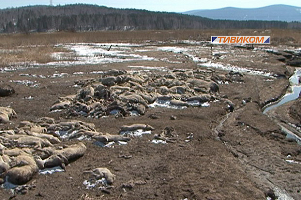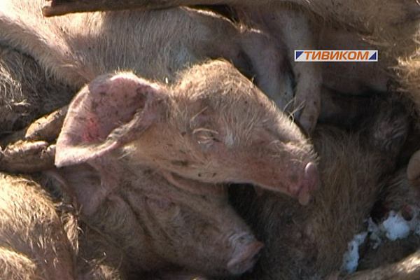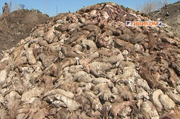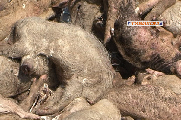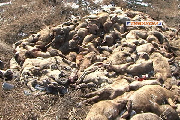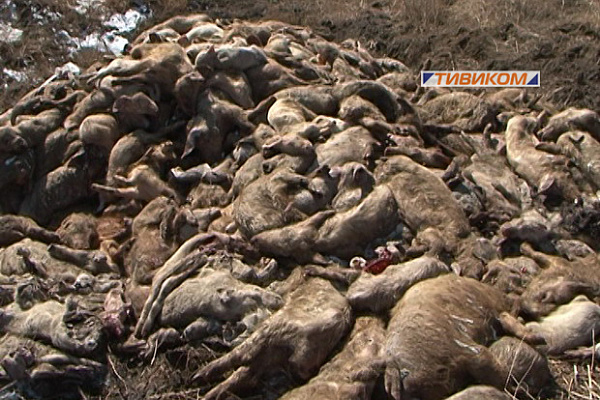 Трупы тысяч животных свалены в кучи. Судя по гнилостным изменениям, свиней свозили сюда, начиная еще с минувшей зимы.