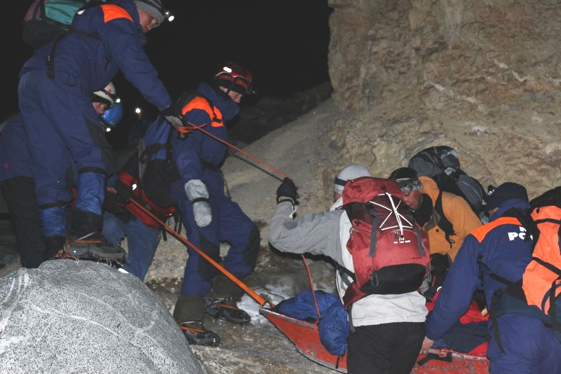 На наши крики хоть мы и были в форме спасателей тоже никто не обращал внимания.Мужик стонал от боли, просил воды и замерзал. А люди как ни в чем не бывало копашились на вершине. Примерно час мы оказывали ему первую помощь и делали веревочные носилки. Потом пробывали нести. Приняли решение на русскую сторону через вершину.Мужик оказался тяжелый думаю около 90 кг. Начали вчетвером вверх по снегу и камням по 50 см 5 раз потом отдых, но быстро выдохлись.