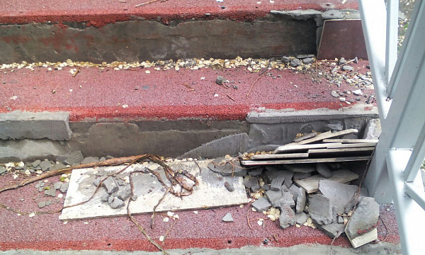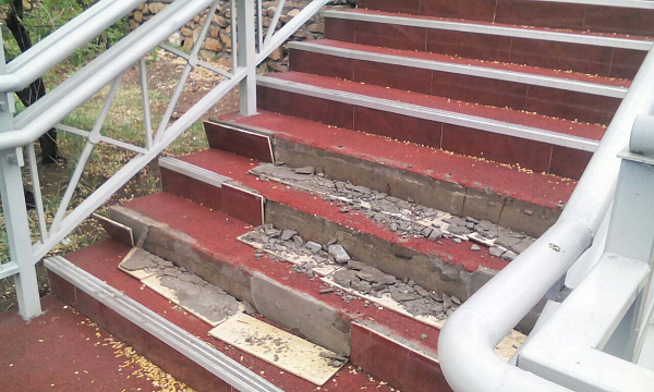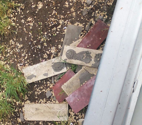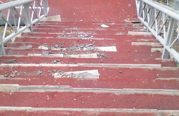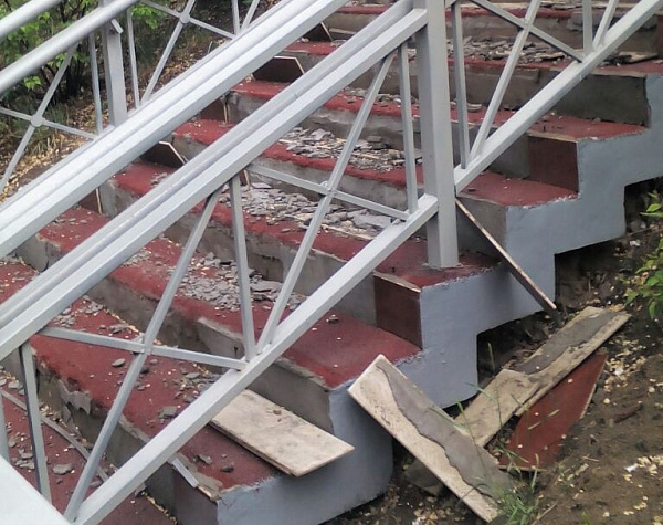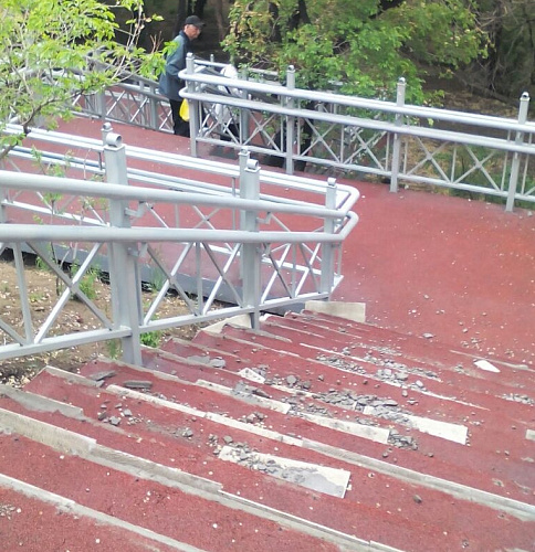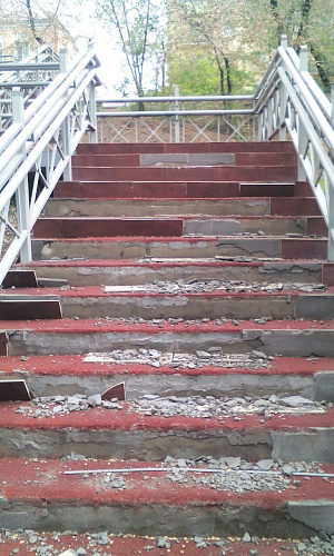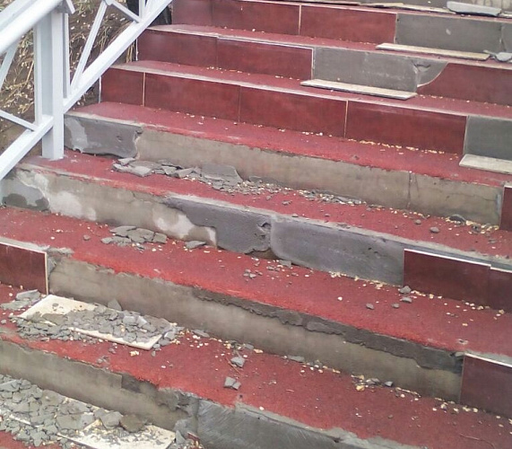 Ступени вниз от здания бывшего роддома на проспекте Победы на улицу Балтахинова, у мемориала Победы, теперь выглядят как после бомбежки: практически на каждой отодрана плитка и сбита металлическая окантовка. Множество осколков свидетельствуют о том, что вандалы специально разбивали керамику. Возможно, часть плитки унесли с собой.
