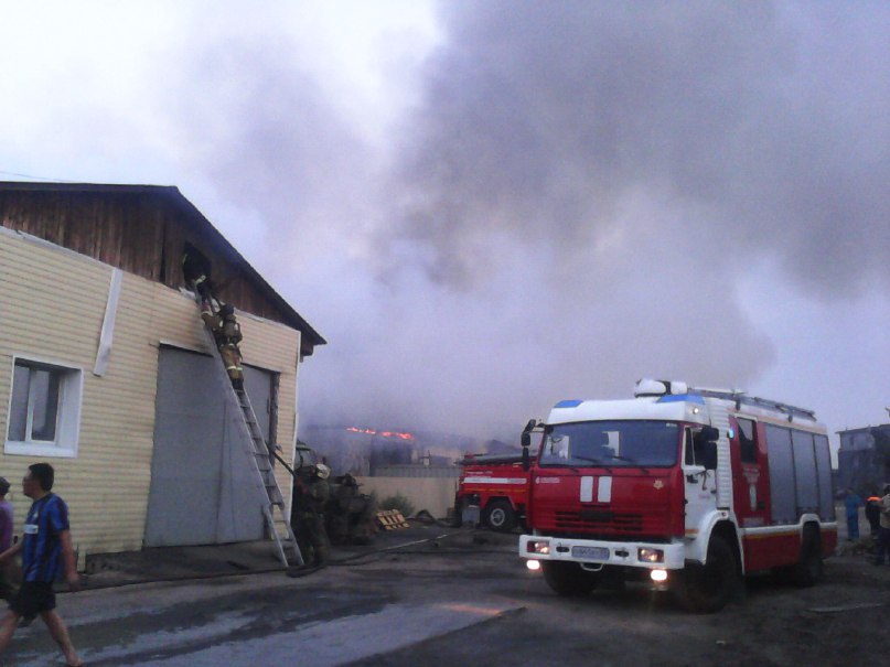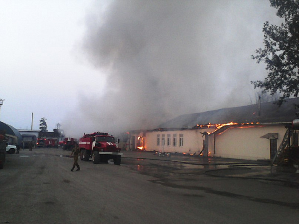 В горящем помещении располагался автомобильный цех и столовая. Хлопки – это, вероятно, взрывающиеся канистры с бензином.