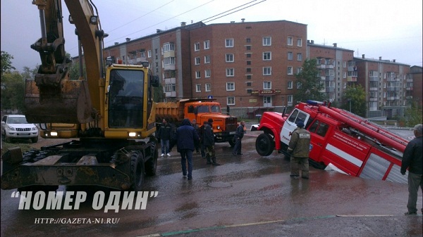 Пожарную машину удалось вытащить с помощью двух МАЗов. Сейчас тяжелая техника убирает асфальт вокруг образовавшейся ямы чтоб изучить грунт на рыхлость перед ремонтом. Ее глубина 1,5 метра, а в диаметре яма около пяти.