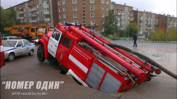 Сегодня утром в районе Шишковки пожарная машина на ходу провалилась в асфальт. К счастью, никто из огнеборцев не пострадал