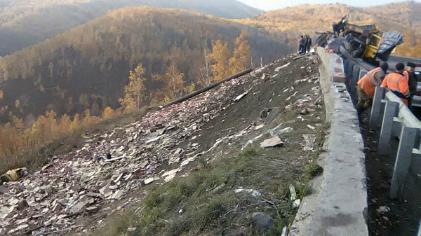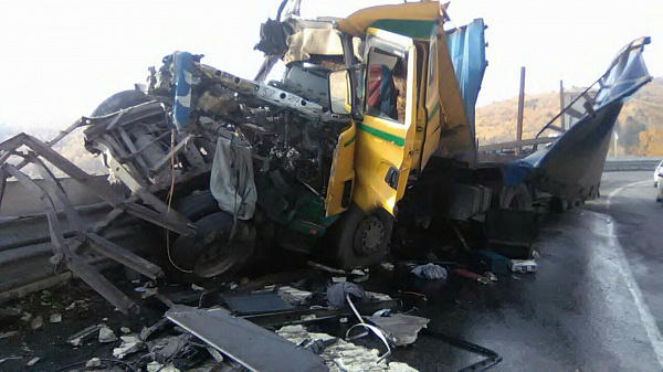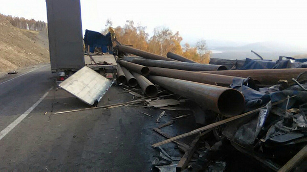 5 октября около 15.00 водитель седельного тягача, груженый металлическими трубами на затяжном горном спуске перед поселком Култук Слюдянского района не справился с управлением и допустил столкновение с другим грузовиком, перевозившем 18 тонн соков