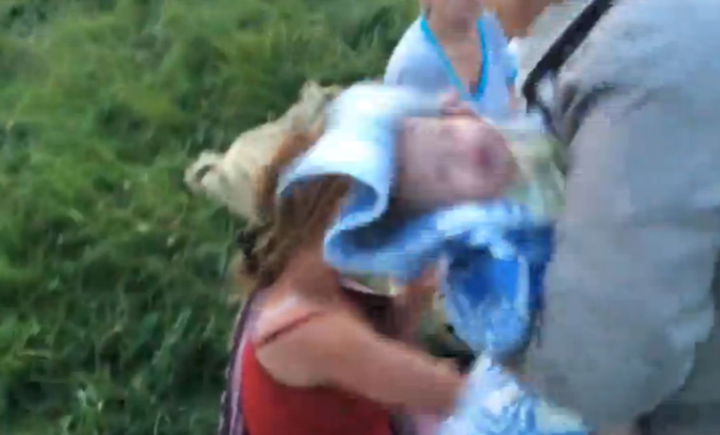 Затем к ним подходят несколько женщин и, забрав детей, начинают жестоко избивать их мать и бабушку, слышны крики и мат. Причём все это происходит на глазах у детей. Они молча наблюдают за происходящим. Затем девочка от страха закрывает глаза ладошками.