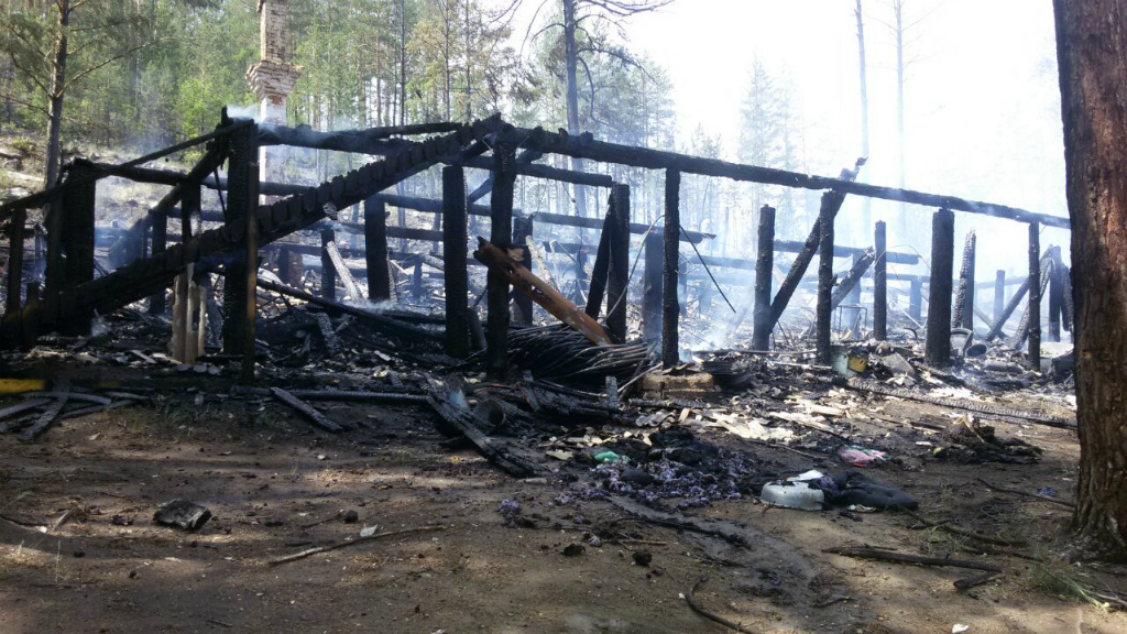 По предварительным данным, лагерь не был окружен защитными минерализованными полосами, поэтому произошел переход огня от здания в лес.