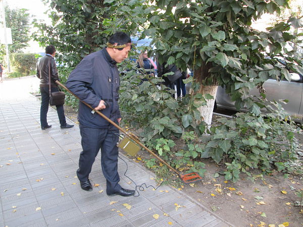 Кусты рядом с хостелом прочёсывают металлоискателем сотрудники СКР. Обследуется вся территория вокруг здания.
