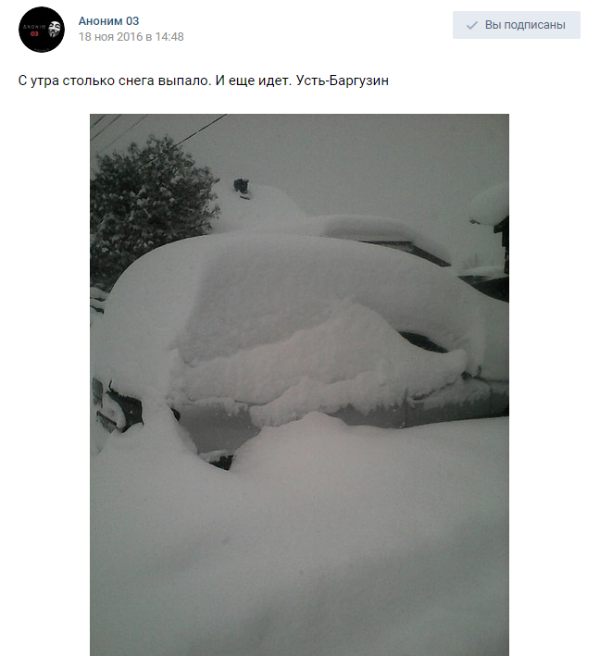 Всего же снегом завалило три байкальских района - Баргузинский, Кабанский и Прибайкальский. Высота сугробов здесь достигает нескольких метров - машины застряли в «снежном плену», снег доходит едва ли не до крыш домов. УГИБДД Бурятии уже обратилось к автомобилистам с просьбой по возможности воздержаться от поездок в данных направлениях.