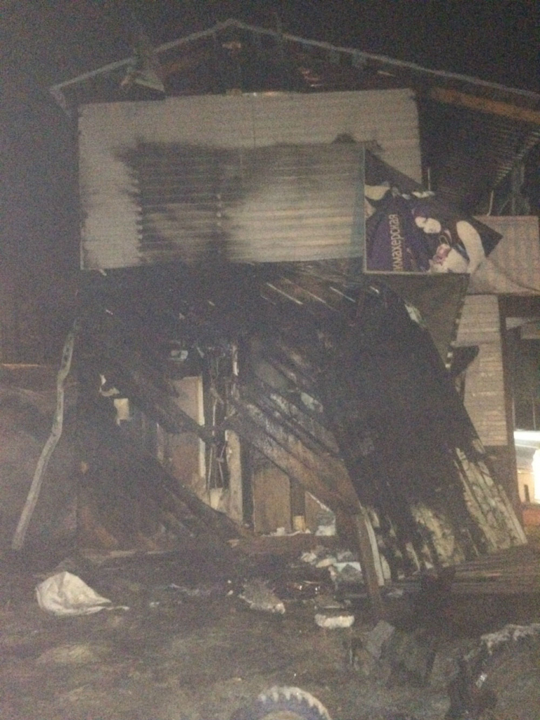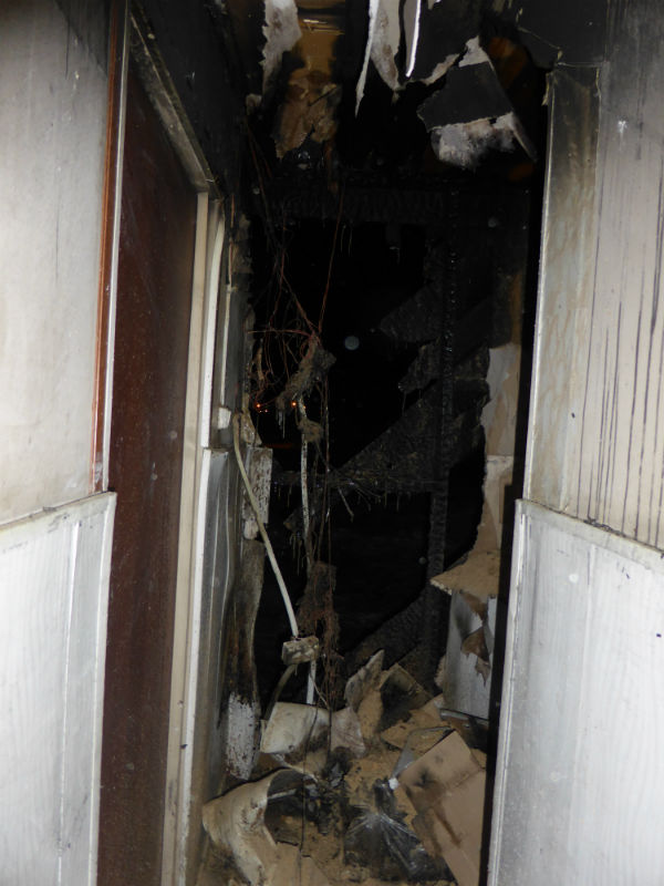 В результате пожара повреждена стена первого и второго этажей с южной стороны, произошло закопчение и оплавление натяжных потолков первого и второго этажей по всей площади.