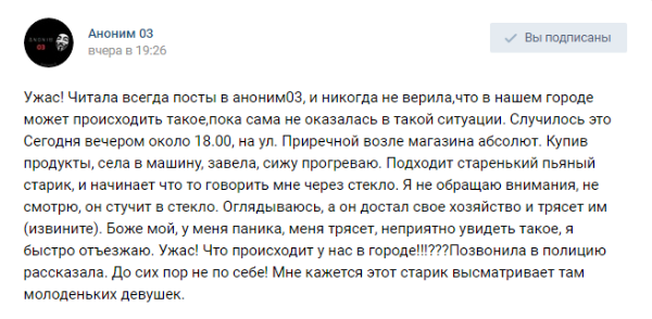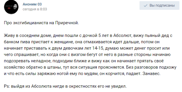 Накануне в популярном паблике «Аноним03» появилось сразу несколько сообщений с жалобами на нетрезвого «эксгибициониста» у магазина «Абсолют» на улице Приречная. Как рассказал один из пользователей соцсети, воскресным днём он отправился с 5-летней дочерью в магазин. По дороге он заметил, как «пьяный дед» приставал к женщине, а затем к двум девочкам-подросткам.