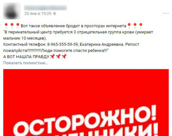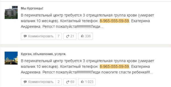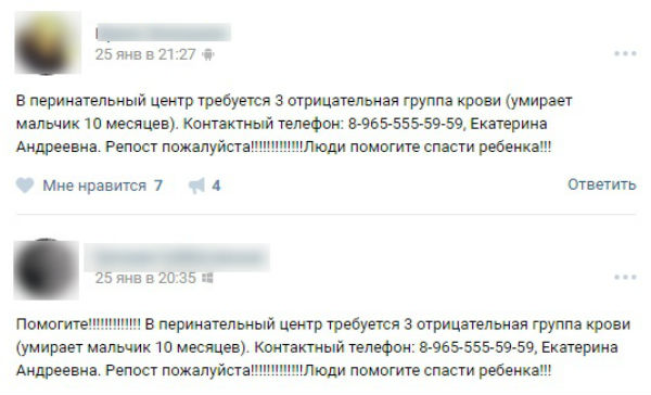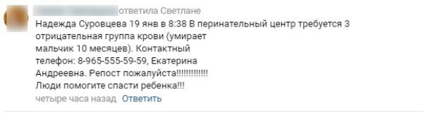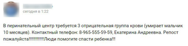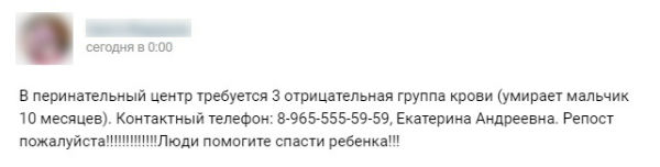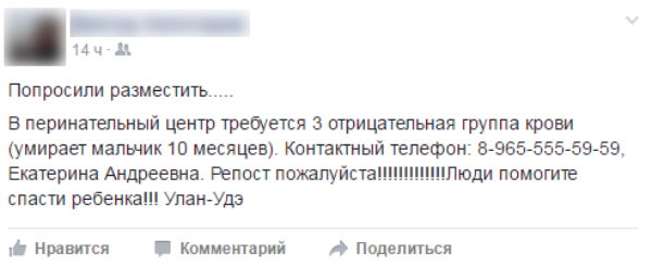 - В перинательный центр требуется 3 отрицательная группа крови (умирает мальчик 10 месяцев). Контактный телефон: 8-965-555-59-59, Екатерина Андреевна. Репост пожалуйста! Люди помогите спасти ребенка! - гласит сообщение, которое сердобольные жители Бурятии активно репостят.