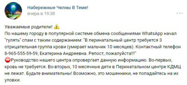 Оказалось, идентичное сообщение распространяется со всех городах России. Только по первому клику можно найти его репосты жителями Санкт-Петербурга, Пскова, набережных челнов, Челябинка, Воронежа.