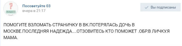 Накануне в соцсети появилось сообщение с просьбой помочь взломать страницу в «ВКонтакте». Автор сообщила, что это необходимо в связи с тем, что её дочь потерялась в Москве.