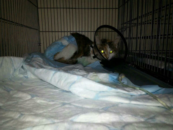 Сейчас кошка, которую спасители назвали Рада, находится в ветеринарной клинике Айболит по ул. Ключевской 55. У неё обнаружены плохая работа печени, перебит нерв в районе поврежденного крестцового подвздошного сочленения, перелом плечевой кости передней правой конечности и вывих тазового сустава задней левой конечности. К тому же животному хирургическим путём введён катетер для выведения мочевой жидкости.