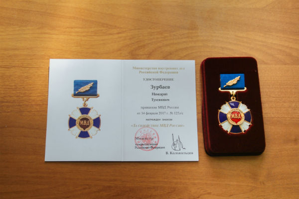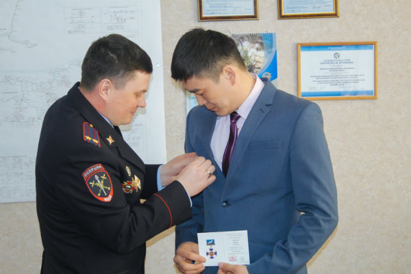 Сегодня начальник управления МВД России по Улан-Удэ Дмитрий Семёнов в торжественной обстановке вручил 27-летнему улан-удэнцу Намсараю Зурбаеву нагрудный знак МВД России «За содействие МВД». Награда была вручена за активную жизненную позицию, проявленное мужество и личную инициативу при задержании преступника, сообщает пресс-служба МВД по Бурятии.